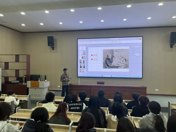 涂元生副教授的示范观摩课分两部分进行。一是《专业素描(一)》在“人物造型”这一部分结束后的小结,由三位同学结合对同学作业点评,协作完成对此前学习内容归纳;二是在此基础上由教师进行经典名画与学生模特写生对比分析的新课教学。涂老师的课程设计,重点突出了专业认证的师范性特征,即要求轮流上讲台进行PPT演示的同学结合中小学教材与课标对同学们的“人物造型”作品从比例、结构、动态、色彩四个维度进行评价分析,然后,同学与老师点评,涂老师在点评中,特别突出了三位同学讲课的肢体语言、眼神交流以及课堂互动环节的实际运用。随后开始新课的学习,进一步展示有关人物造型的世界名画对比分析同学们模特写生的问题之所在,将知识的重点与难点深刻融入对作品对比分析之中。从教学方法上,引导同学们进一步实施大学与中学课堂衔接。既巩固了素描专业技能的学习,又提升了学生的教学实践能力。